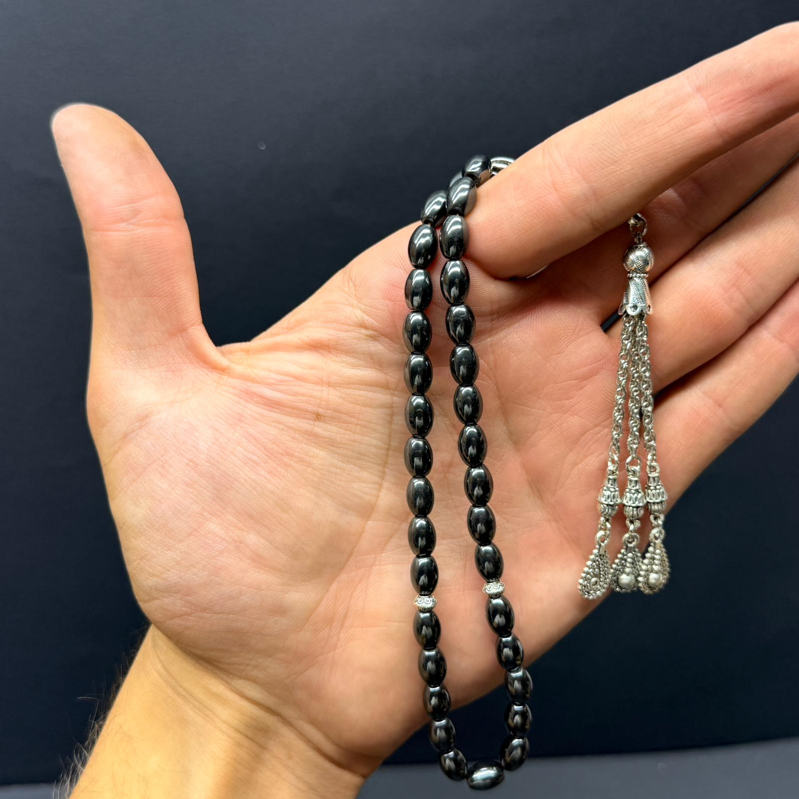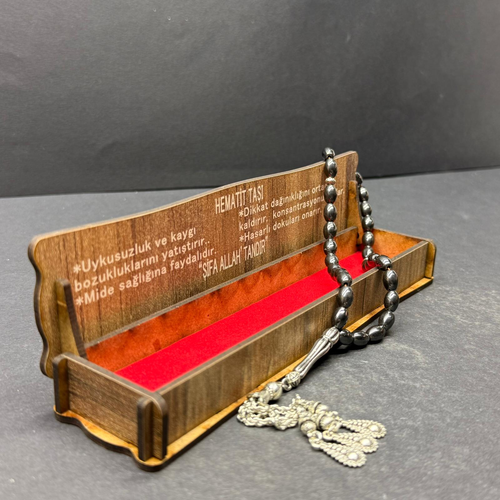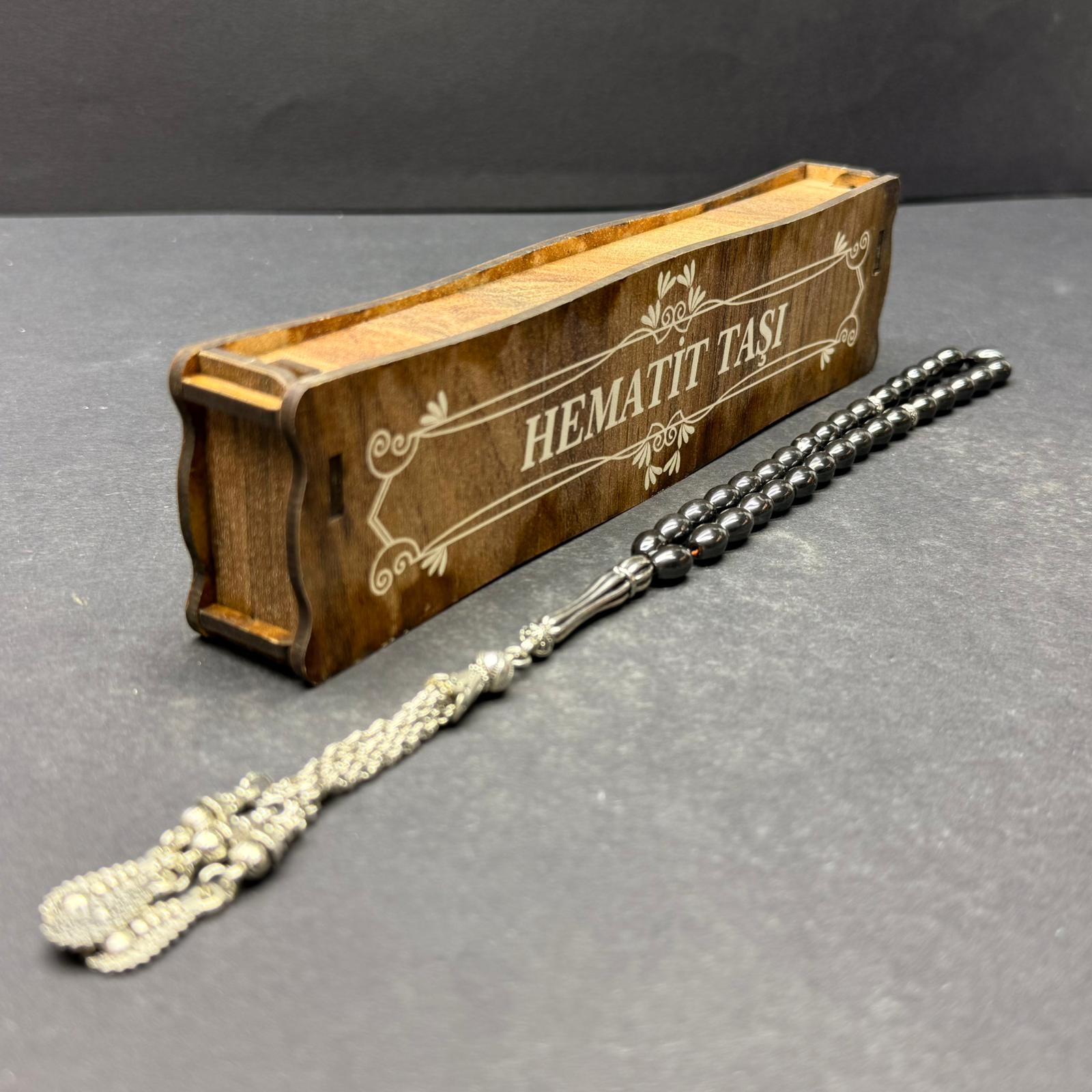 Özel Ahşap Kutulu 33’lü Hematit Taşı Gri Renk Tesbih – Arpa Kesim